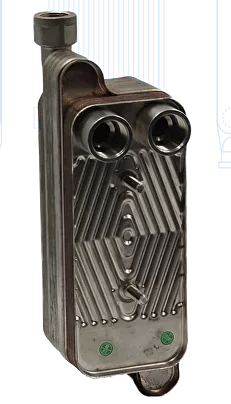 Вторичный (пластинчатый) теплообменник: Его задача — нагрев горячей воды для кранов и душа. Принцип работы: горячий теплоноситель из первичного контура (отопления) проходит через пластины этого теплообменника и передает тепло холодной водопроводной воде . Его мощность напрямую зависит от количества пластин.
